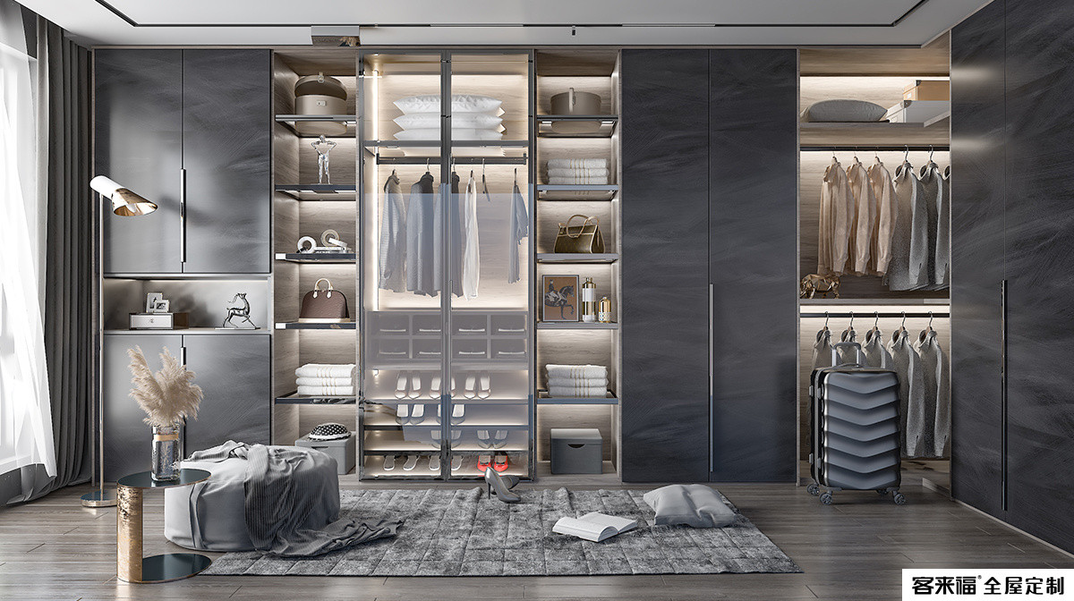 The cloakroom of the mid-summer series adopts cement dark gray particle board super elegant board, which uses a more reasonable space design, which is beautiful and has a better storage effect.