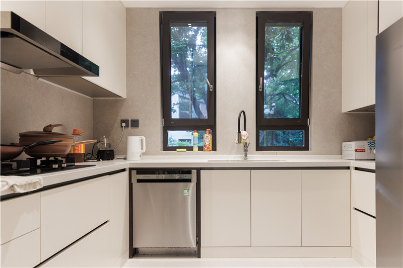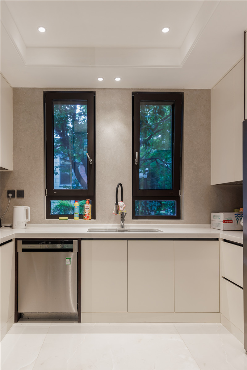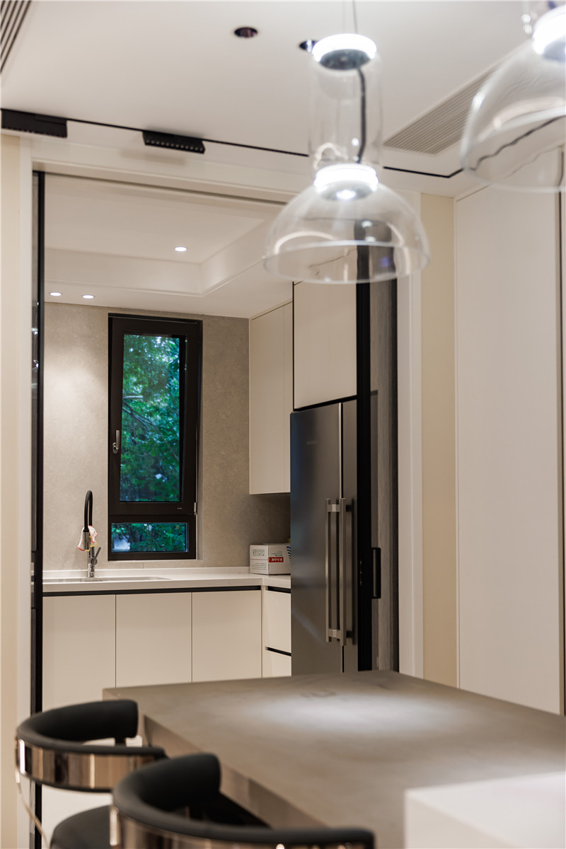 餐厨空间在整个一楼中占地面积很宽裕,所以除了U型橱柜外,还在餐边柜前做了含有岛台的西餐区,望着窗外屋内的绿意吃一顿早餐,应该非常惬意吧~