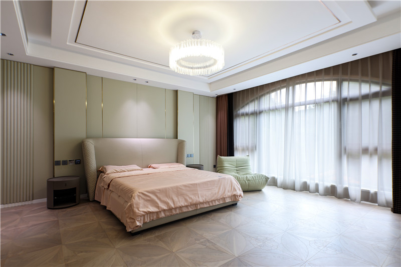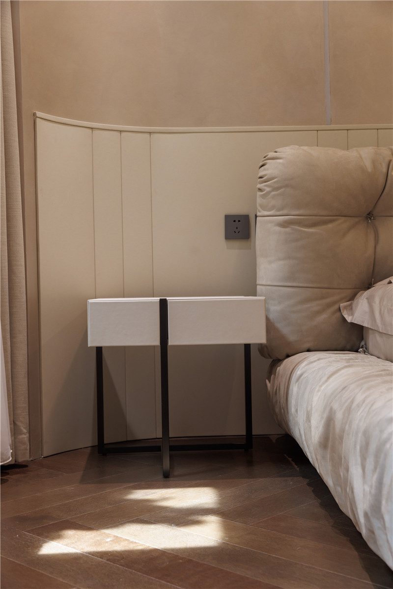 主卧的空间中背景墙采用了PU的皮革拼接护墙,半圆形的落地窗搭配白色窗幔十分优雅。衣帽间一侧采用了超白玻柜门的金属衣柜,用于收纳;另一侧采用的是壁挂式的衣架方便展示,下方做悬挂式抽屉补充收纳。