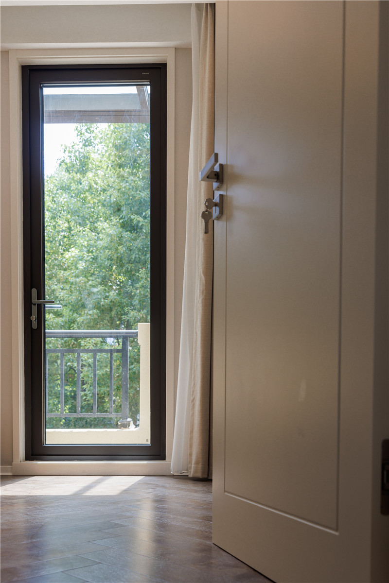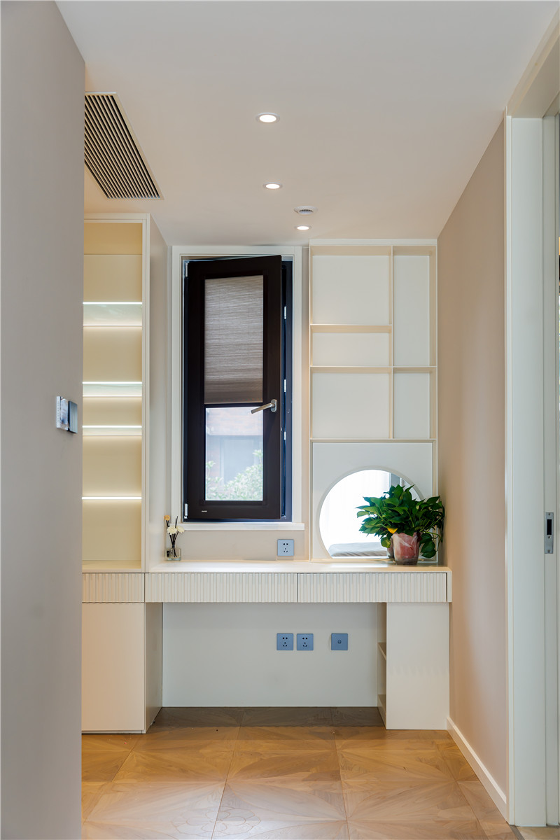 进入次卧空间内便是次卧的衣帽间,到顶的柜门采用一体化的铣型拉手,更显简洁干净。次卧空间的自然光线来源于两扇拱形窗户,让整个房间通透的同时增添了一份奶油风的温馨治愈。