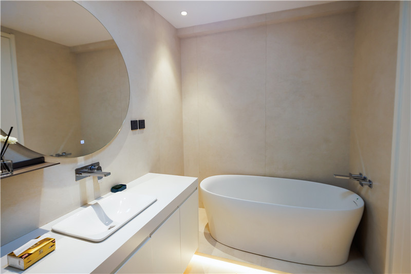 次卧空间的卫浴在睡眠区一侧,所以做的是封闭式格局,白色的卫浴柜收纳起了大部分的生活用品,壁龛也承担起另一部分的储物需求,淋浴区放了浴缸,提升生活质量。