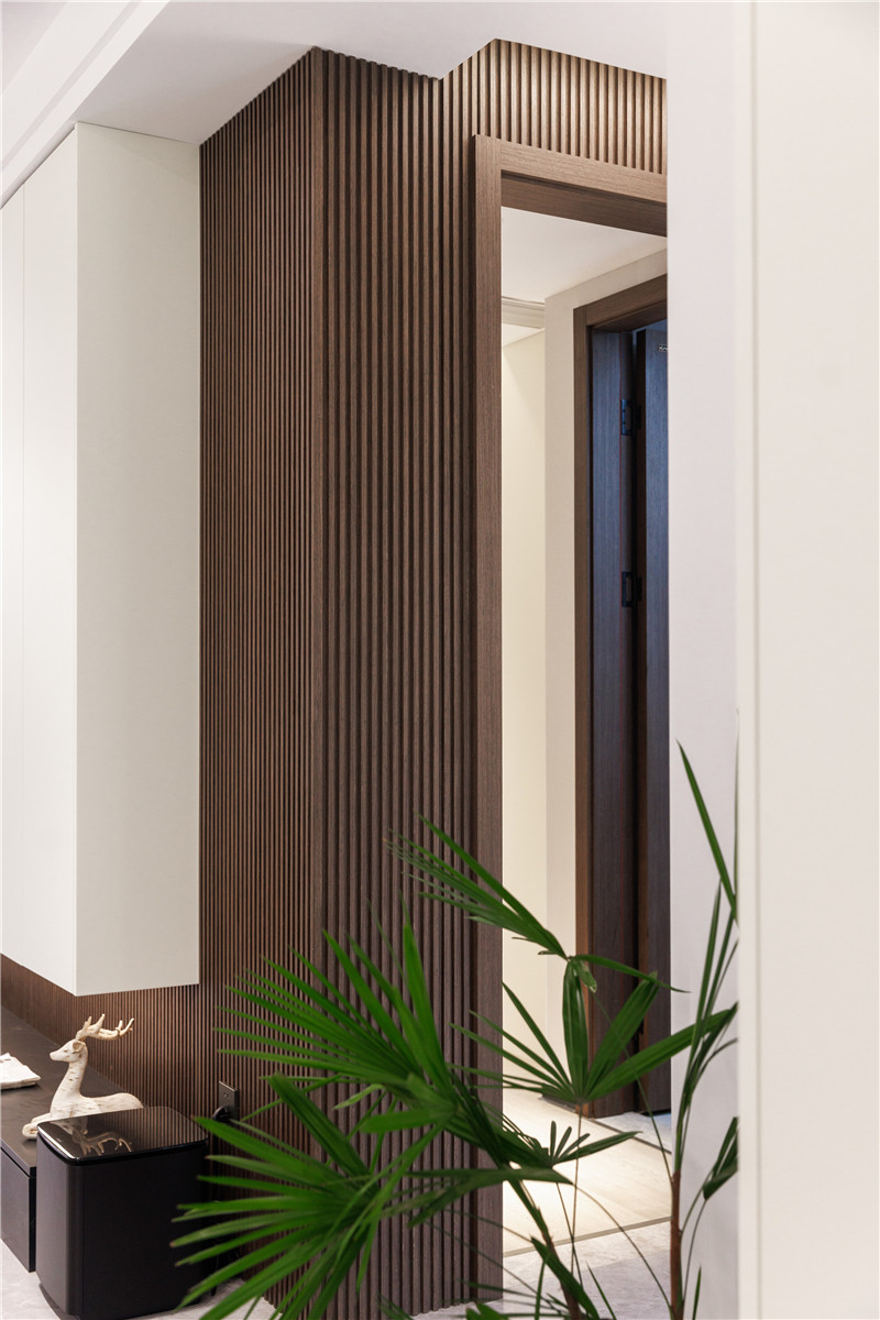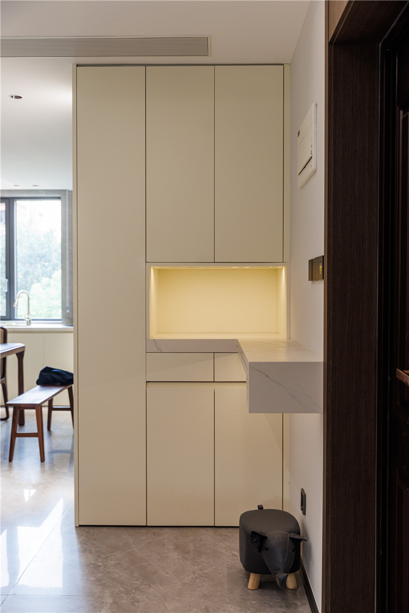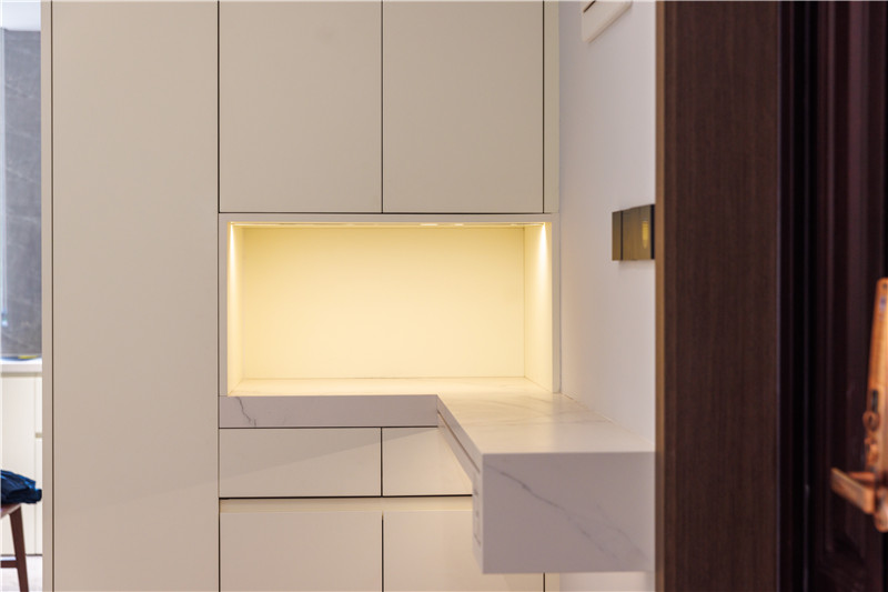 在玄关为了提升空间利用率,我们采用了嵌入式的柜体进行上下分区收纳。中部掏空后延伸大理石台面作为置物台,放置一些小物品都很实用。