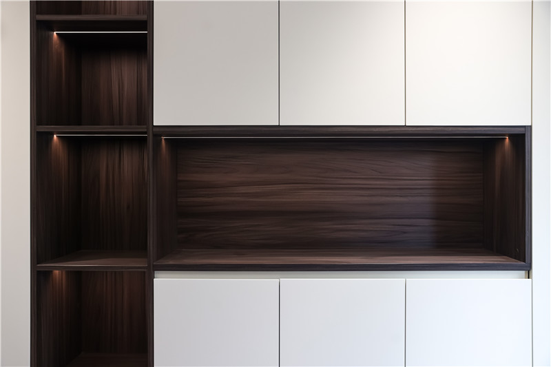 围合式的空间布局里,电视柜成为环境的主角,以纳科榆木打底,再以芬兰白柜体进行生活收纳。