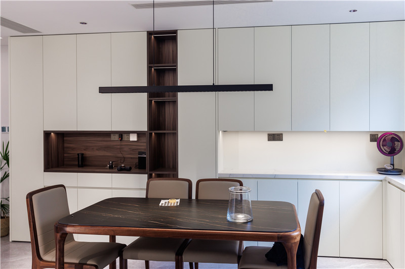 餐厨空间的设计风格与起居空间保持一致,除了传统的U型封闭式中厨外,在用餐区还做了高定全屋围合的设计。