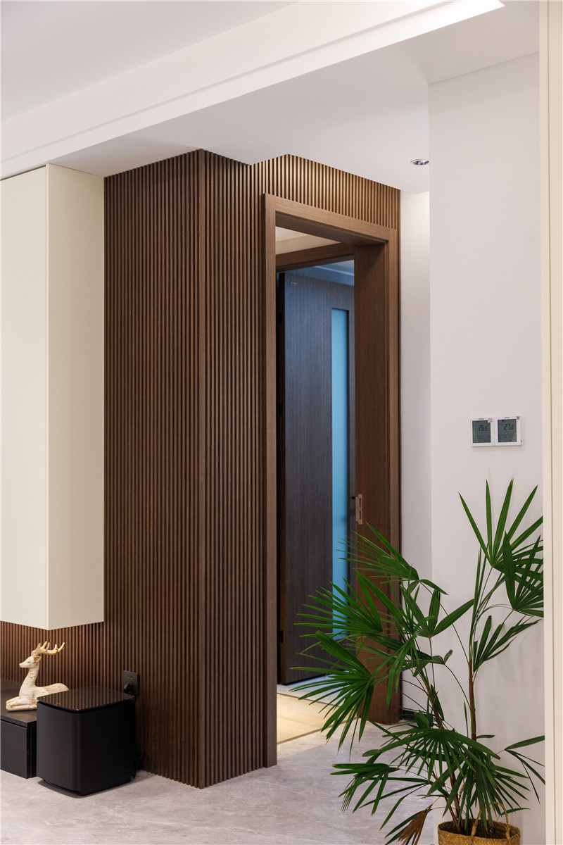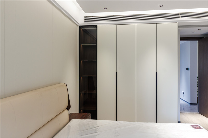 主卧空间延续一贯简约的设计手法,注重提升家居质感,强调人文的居住感受。自客厅格栅背景墙延伸至卧室空间,做成一体化的门套门框及门扇。