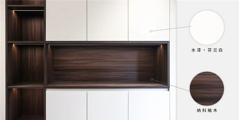 木门则采用特调的烤漆调色,与纳科榆木的墙、柜形成呼应,全屋设计浑然天成,美在不言之中。