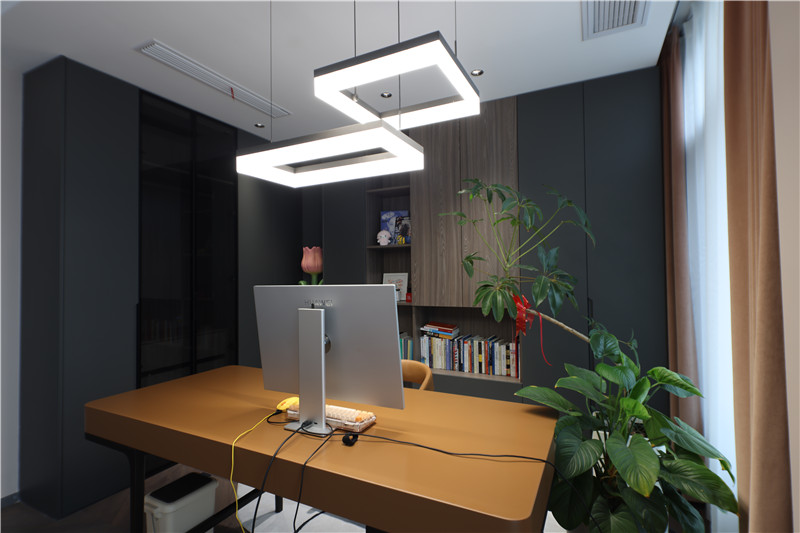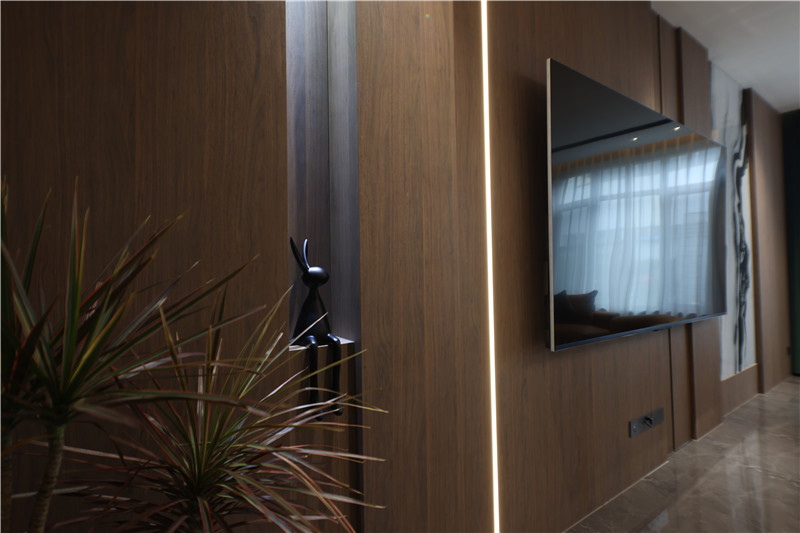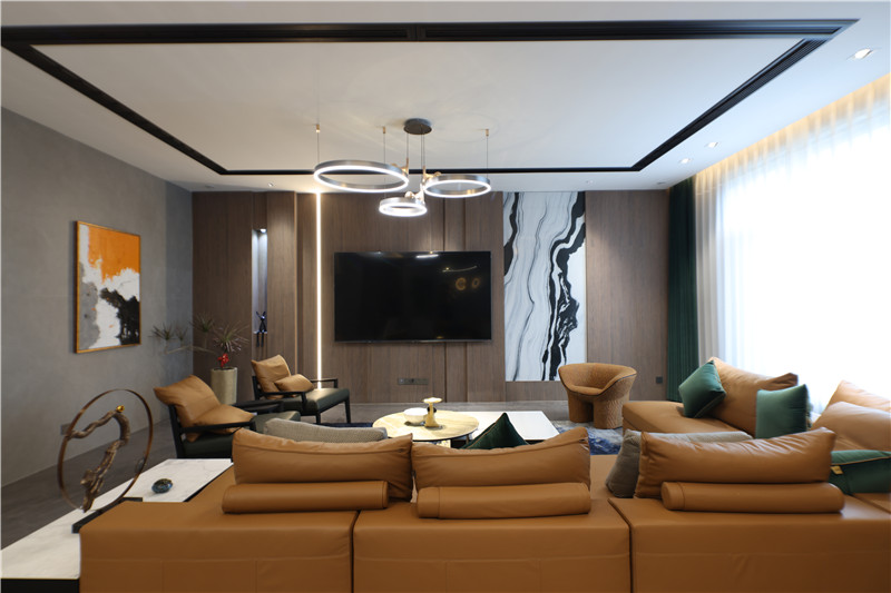 整面木质电视背景墙,引入金属线条、装饰构造,多种层次造就别样魅力;艺术主灯+射灯+条带灯,氛围感不言而喻;L型沙发配合圆弧茶几与方形底座,便捷舒适。