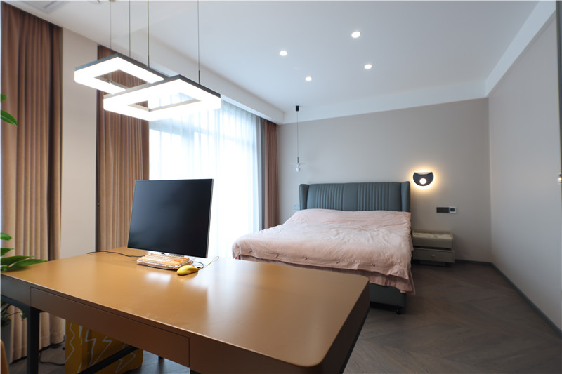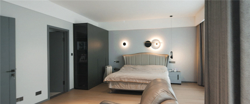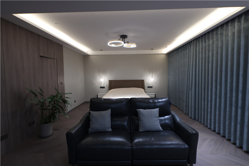 主人房:遵循主人喜爱的对称设计,包含床头柜、床头灯、沙发等,干净利落;整体色调不抢眼却彰显韵味;隐形推拉门的运用,视觉平和。