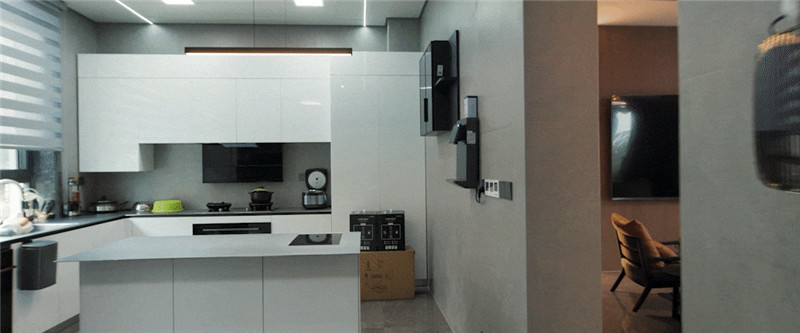 厨房采用中性色,整体简约大方;将烤箱等大电器嵌入柜体中,视觉明朗;橱柜+岛台式设计,优化整体空间动线。