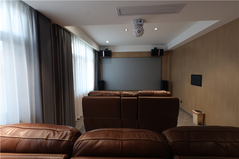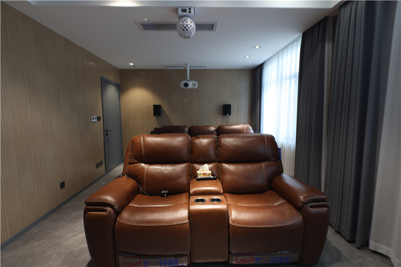 墙体整面背景墙,以木材的温润感成就舒适空间;以投影代替电视机,布局合理;这样的空间还能作为多功能房使用,分散压力。