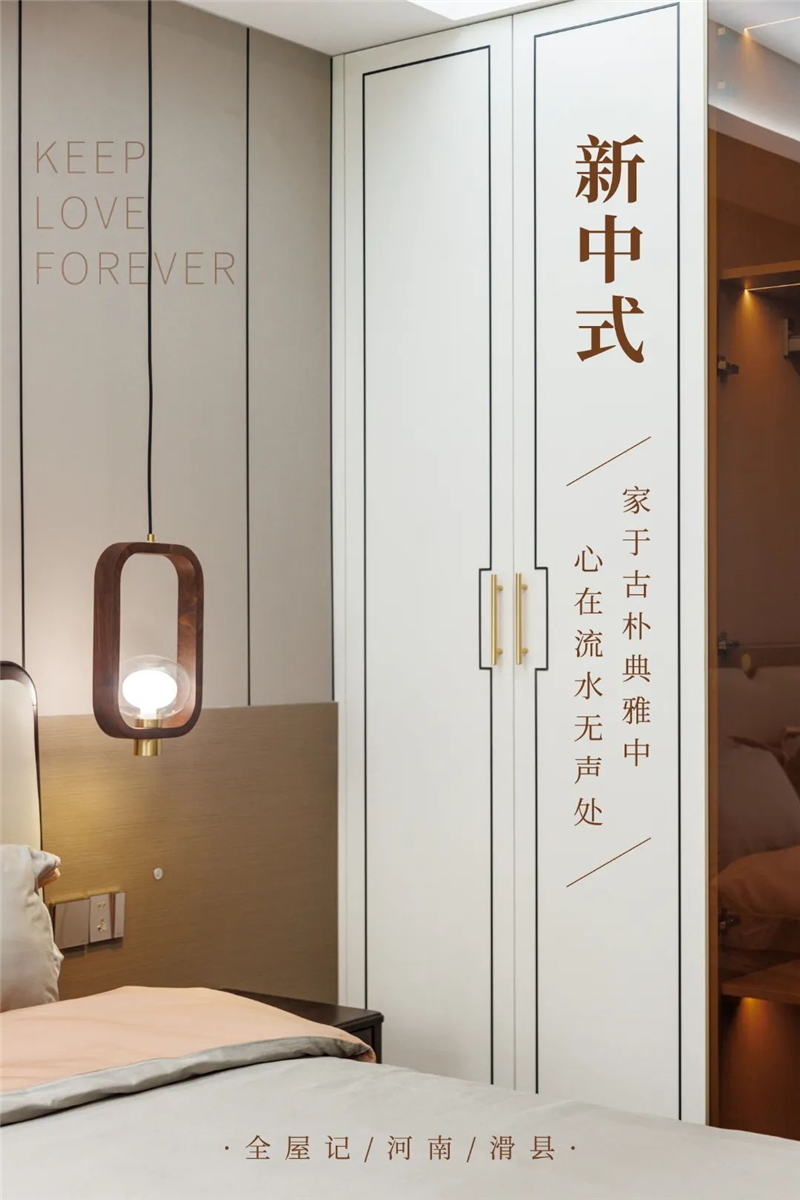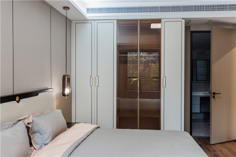 主卧延续了餐边柜的配色设计,兰迪白与科技直纹的恰到好处融合,充分发挥新中式的淡雅魅力。