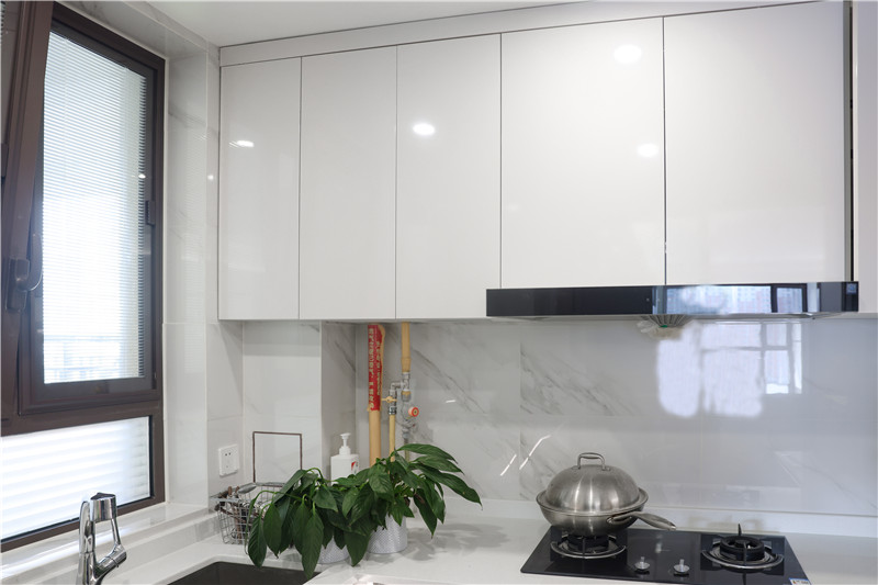 厨房贴墙而建呈小U字型构造,无拉手设计使得整体视觉清新,简单几平米的烹饪区,动线明晰、存储在线。