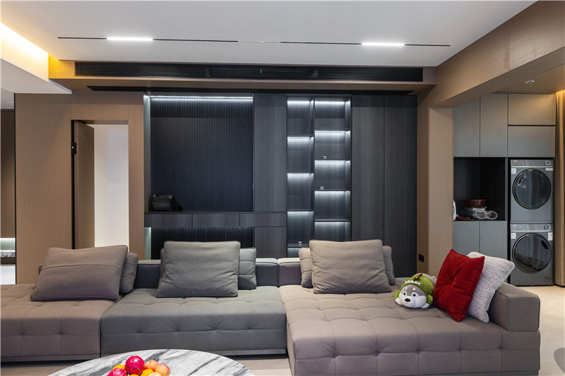 沙发背景墙为家里的动线区,立柜+穿插设计贴墙而立,好看且颇显趣味。