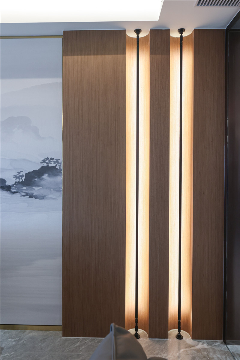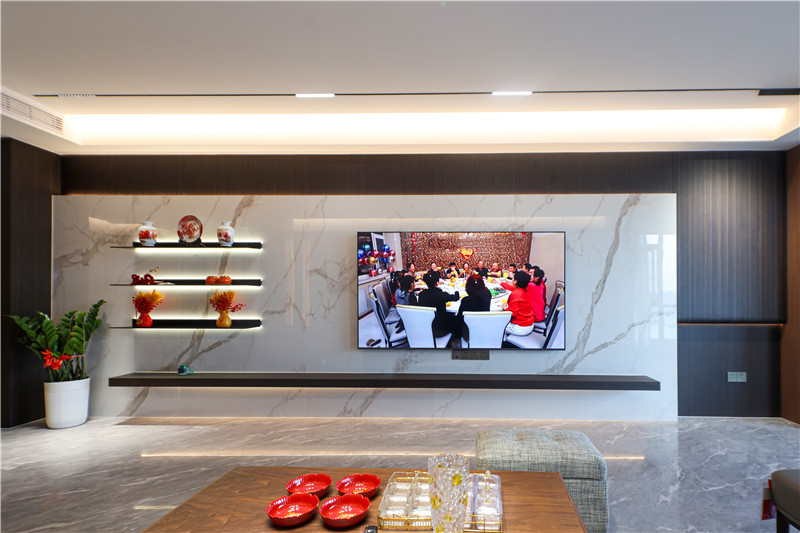 电视背景墙内里整面木材拼接整块大理石板,彰显层次感;背景墙外嵌铝板及整面木板,发挥收纳桌及展示柜效用。