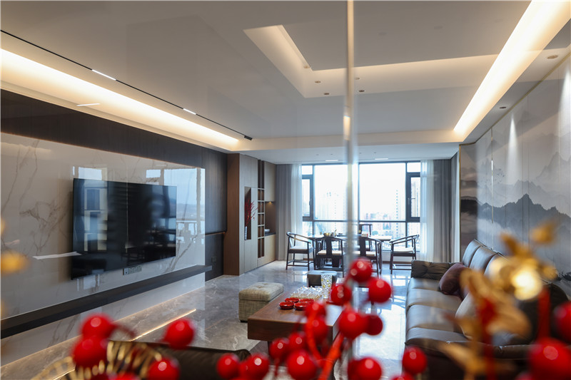 客厅开放式设计,整体无主灯设计造就空间氛围感,其与阳台贯穿使得空间敞亮。