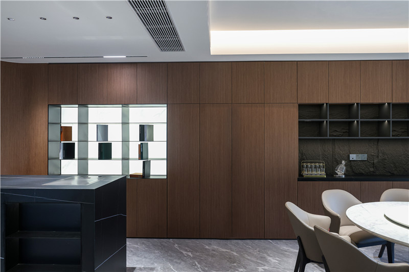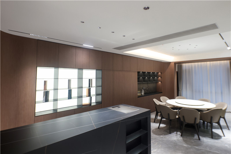 中西结合式餐厨空间,其餐厨背景墙整面柜体嵌入开放格,可做展示柜、酒柜使用。