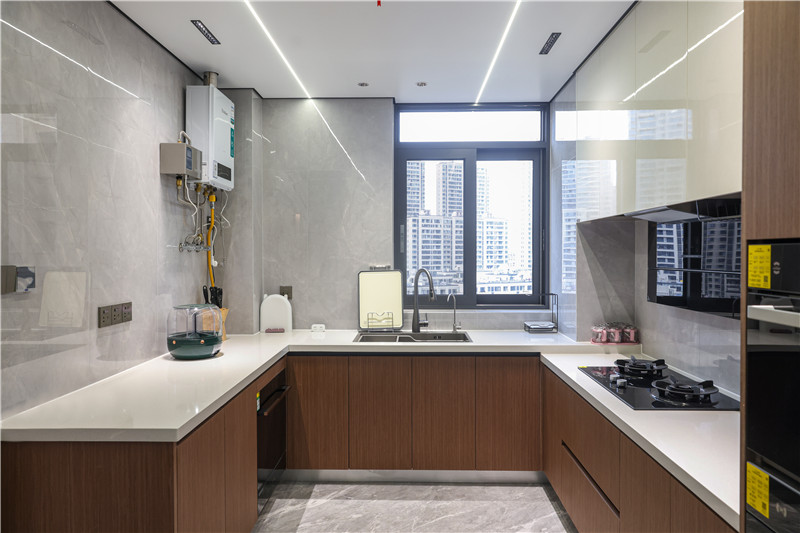 独立式岛台让烹饪地成为一家人的情感升温地,其岛台黑调点缀以白线,加入智能操作设备,使得整体空间清新明亮。
