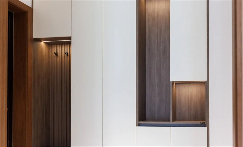 柜子设计:玄关柜一柜到顶既满足收纳需求,顶部空间也不用再打扫;功能分区:利用深色穿插设计,将挂衣区与放鞋区隔开;封闭式与开放式挂衣、封闭式放鞋区更符合日常使用习惯。