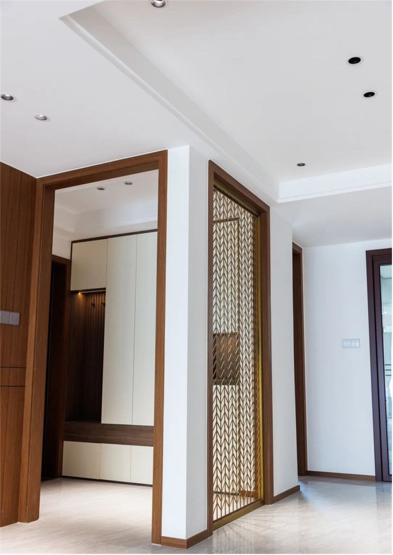 中式氛围:采用中式常用到的格栅设计置于开放区背板,增加玄关柜设计感,整体简约不失精致;在玄关与客厅衔接处采用格栅屏风,既起到空间分区,呈现初步中式氛围。