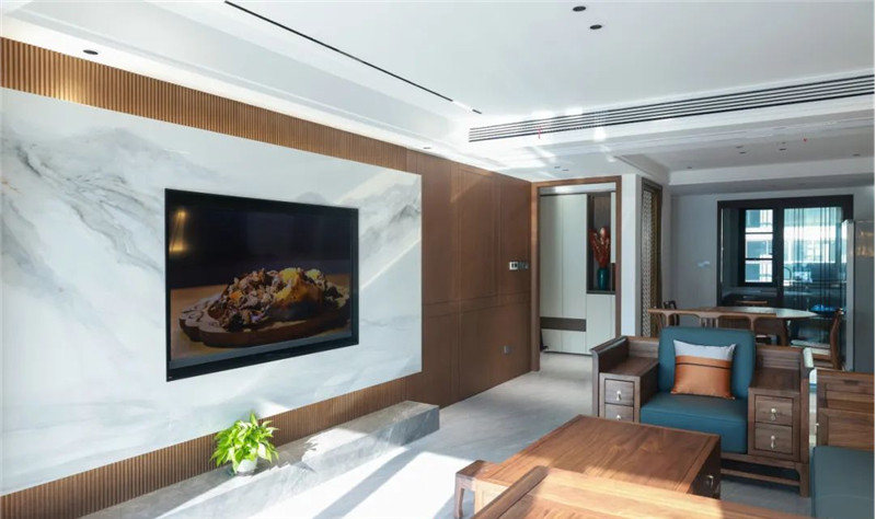 实木格栅、不规则拼接与悬浮山纹大理石构建成电视背景墙,画面观感令人舒适,古色古香;背景墙内含隐形门,巧妙的设计使空间显大,和谐美观。
