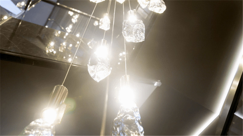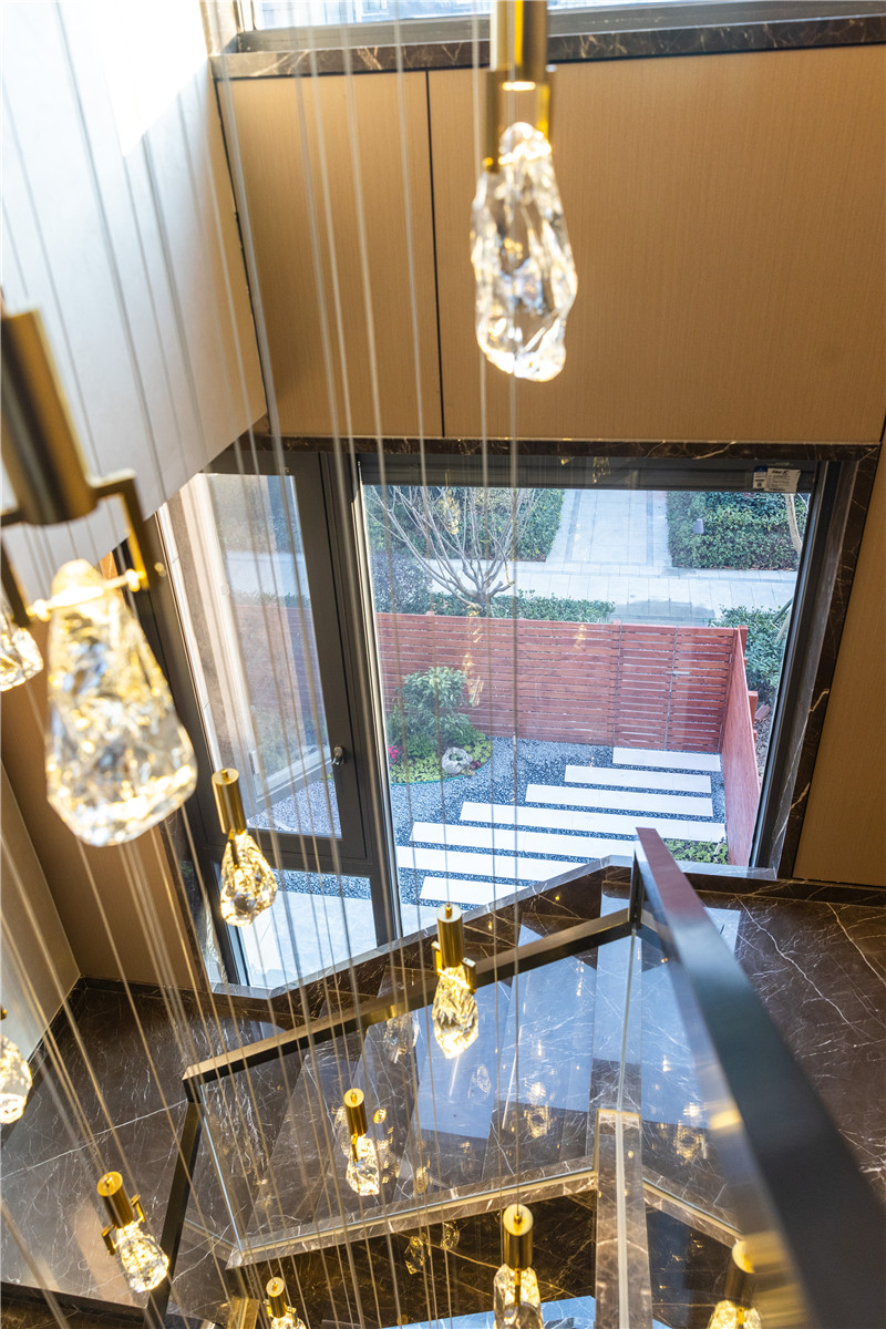 梯座上方设置休息区,谈心、小聚可在这里实现;背侧做狭长展示柜,夹丝玻璃、内嵌灯带,颜值UP!