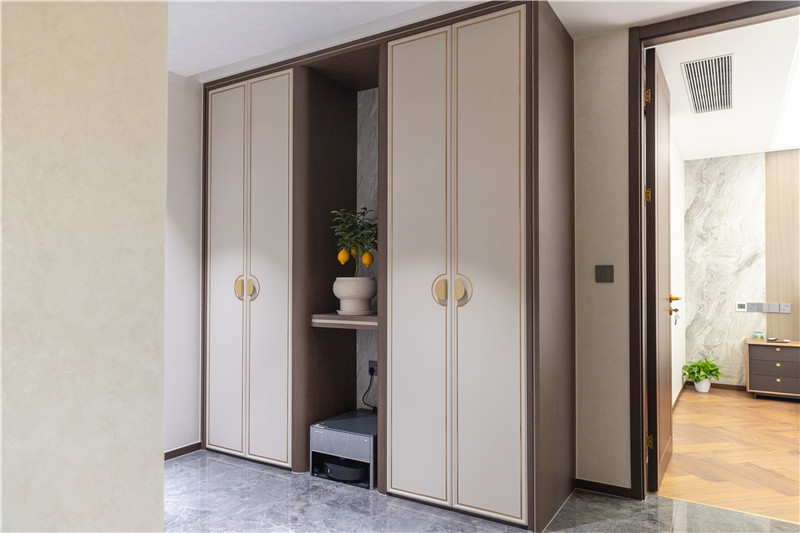 一组一柜到顶柜,中部隔层造景,加入换鞋凳并合理预留扫地机器人放置区,合理且细致;两侧边米褐色门板以金属条点缀,配以中式扇形拉手,好看实用。