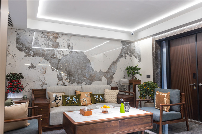 客厅采用中式围合式构造,茶几、沙发、椅子为配套木材,方寸间的沉淀衬中式风骨;沙发背景墙采用整面大理石纹板,亮光属性呼应辅助灯光,增加空间通透感。