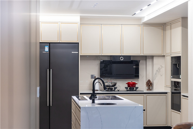 橱柜上下柜无拉手设计,转角处高柜嵌入烤箱等大电器,视觉和谐且收纳力强;一侧独立式岛台,设置以洗水槽及嵌入式设备,分散橱柜压力。