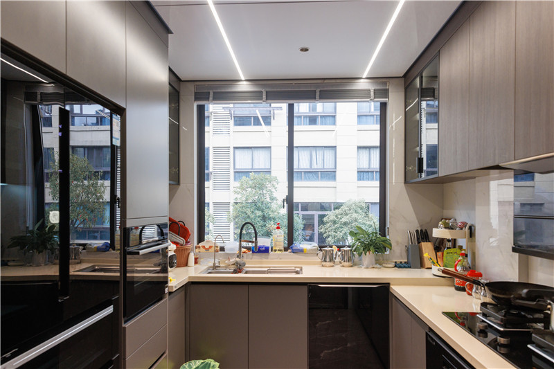 厨房主要以实用功能为主,将空间利用至理想化。U型布局拥有强大的收纳储物能力,将大型厨电内嵌置橱柜中,减轻客厅收纳压力,做饭也变得更便利。