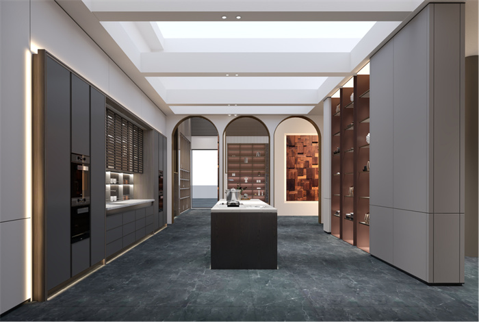 橱柜+智能岛台的空间布局,既节省了空间,也优化了家庭动线。厨房一半采用了嵌入式柜体,考究的布局和纯实木门让餐厨空间简约大气。岛台与烹饪区平行,空间明朗、清新自然。