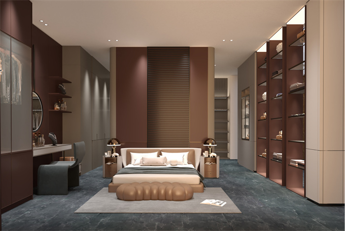 时尚、年轻、“放空”的卧室空间,让生活充满情调。凭借着金属的时尚+低饱和度莫兰迪门板元素,将整体的空间打造出婉约直达内心的意境。