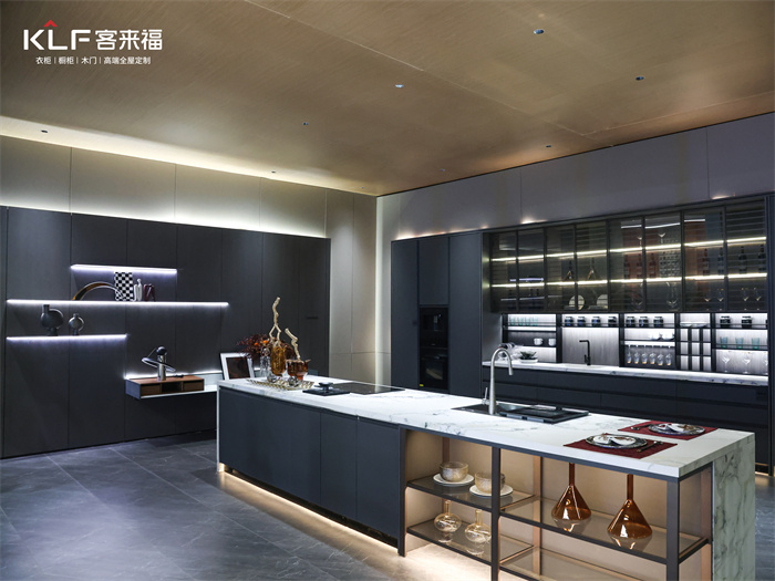 用中式经典元素中珊格隔断,天琛系列客餐厅分离烹饪与用餐空间,让用餐也能拥有艺术感。木饰面与肤感PET结合的橱柜,以同步木纹的米兰·(milan)胡桃颜色碰撞,展现出美丽的大抛物线花纹,兼顾了耐用与美感。