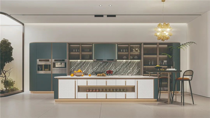 采用圆弧包边设计,将圆弧贯穿整套产品,勾勒温润柔和质感。免拉手灯柱和铝合金灯带,尽显高贵与优雅。既富有意式侘寂的设计风尚,也是对今年高定流行元素的创新性结合。