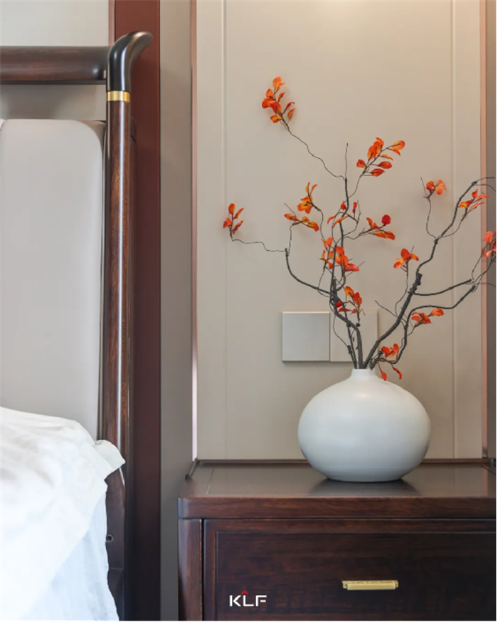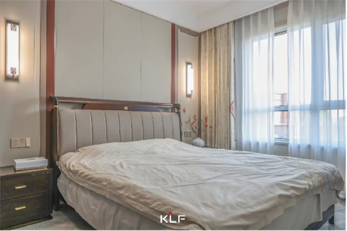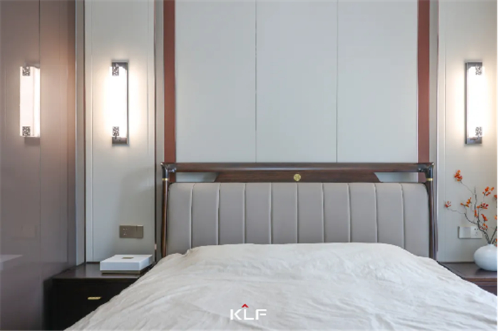 新中式床头背景墙,勾勒出一个宁静悠远的意境,搭配色调淡雅的复古灯具,方寸之间皆是风雅韵味。