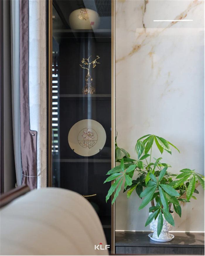 云飞马鸣,开花落叶,事事相关,物物相连。整个客厅以深色为主调,空间局部小品和绿植讲究节奏感与韵律美,与整体风格形成类比,凸显空间的层次感与秩序性。
