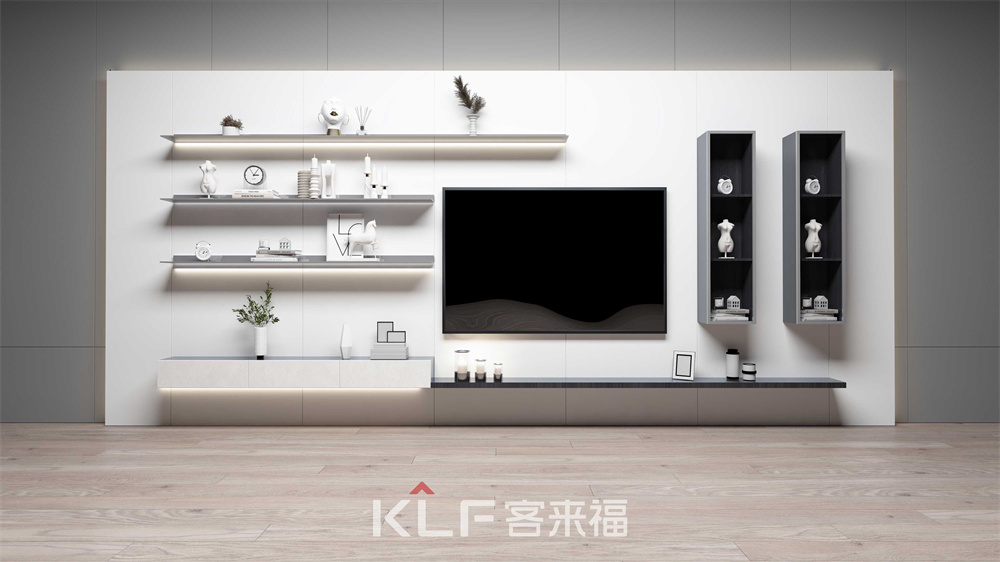 拉深构造增加空间距离,以灰、白、黑三色为基调,简约风格的基础上更显现代时尚轻奢。嵌入式电视背景墙设计,以黑为底打造沉稳大气的新风韵。